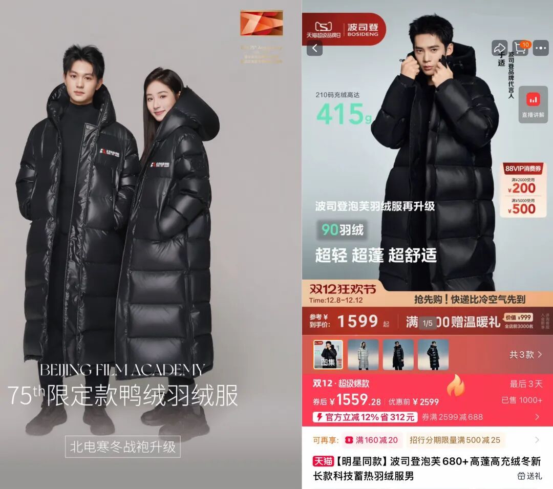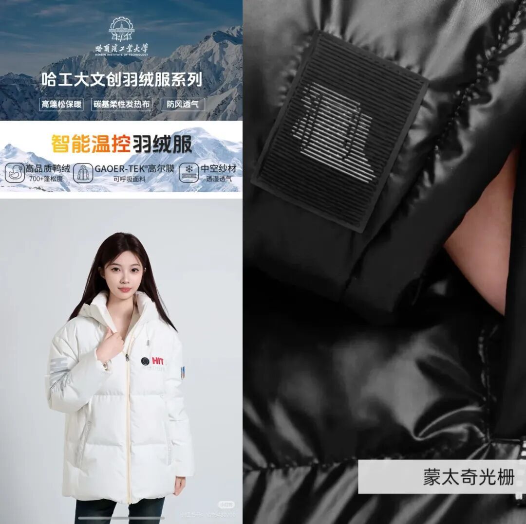 二是名校背书。哈工大、北电等高校凭借专科特点,为羽绒服注入科技或文化内涵。如哈工大羽绒服给与智能温控时期与可呼吸面料;北电羽绒服则贪图有蒙太奇光栅、专属校徽拉链头等细节,突显学校特点。