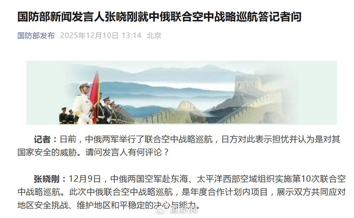 记者:日前,中俄两军举行了纠合空上钩谋巡航,日方对此暗示担忧并觉得是对其国度安全的挟制。教导发言东说念主有何驳斥?