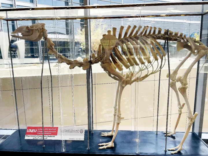 林嘉场地的阿联酋大学正门以及校内眉月楼讲述厅门前的骆驼骨架。图/受访者提供