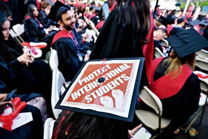 2025年5月29日,好意思国哈佛大学的毕业庆典上,一些毕业生的学位帽上写着“赞助国际学生”的字样。图/视觉中国